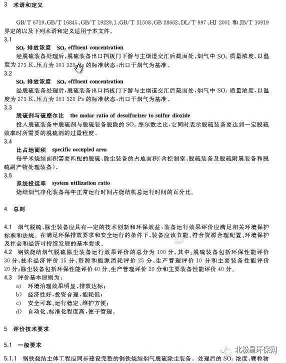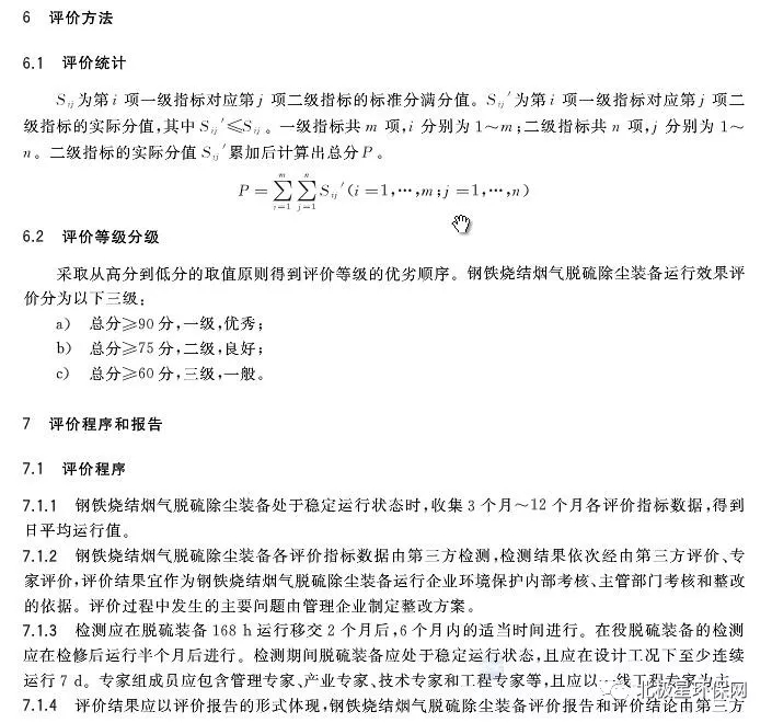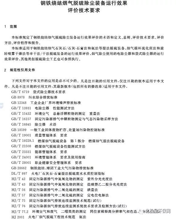 該《標(biāo)準(zhǔn)》適用于鋼鐵燒結(jié)煙氣石灰石/石灰-石膏法和氨法等式濕法脫硫裝備,煙氣循環(huán)流化床法和旋轉(zhuǎn)噴霧干燥法等半干法/干法脫硫裝備的運(yùn)行效果評價(jià),煙氣除塵使用的電除塵和袋式除塵器的運(yùn)行效果評價(jià),其他類似脫硫除塵工藝也可參照執(zhí)行。